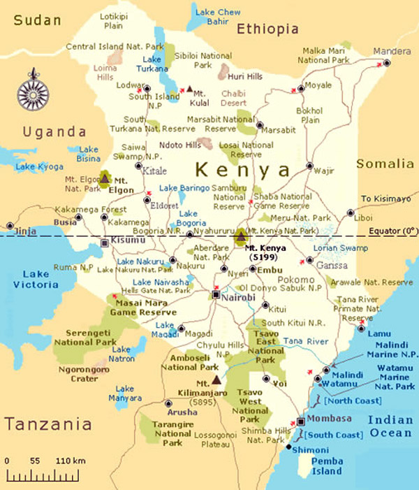Below is a tourist map showing Kenya Tanzania safari route and the popular tourist locations: national parks, game reserves, lakes and the coastline on the Indian Ocean: Mombasa, Zanzibar, Malindi and Lamu.